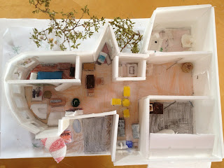 It was a simple concept- the students were asked to draw their dream home on paper and then build a model of it from the given materials. The model had to be at a 1/2" to 1' scale and the roof had to be removable so that we could see inside. All furniture and appliances had to be crafted as well.