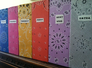 I found the colorful bandannas in the fabric closet and acquired a set of 7 plastic bins from my aunt.